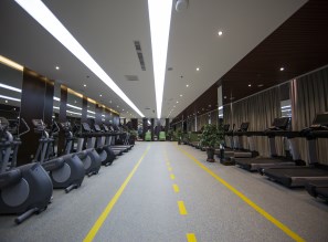 健身中心面积1130平米。配置了60余种健身器械,分更衣区、伸展区、器械区、形体室、休息区、体能测试区、动感单车区、有氧理疗瑜伽区、私教区。全部自然采光并使用美国通用新风交换过滤系统,配备达到医用标准专业的韩国进口体测仪,用微电流测试身体各项指标。健身器械采用著名品牌美国力健;有氧区内所有跑步机均配19寸液晶触摸屏,电子兼容技术及3D立体跑步场景画面将健身投入性与娱乐性融为一体;同时配备了椭圆仪、登山机、台阶机,力量器等对身体每个部位训练的专业器械。